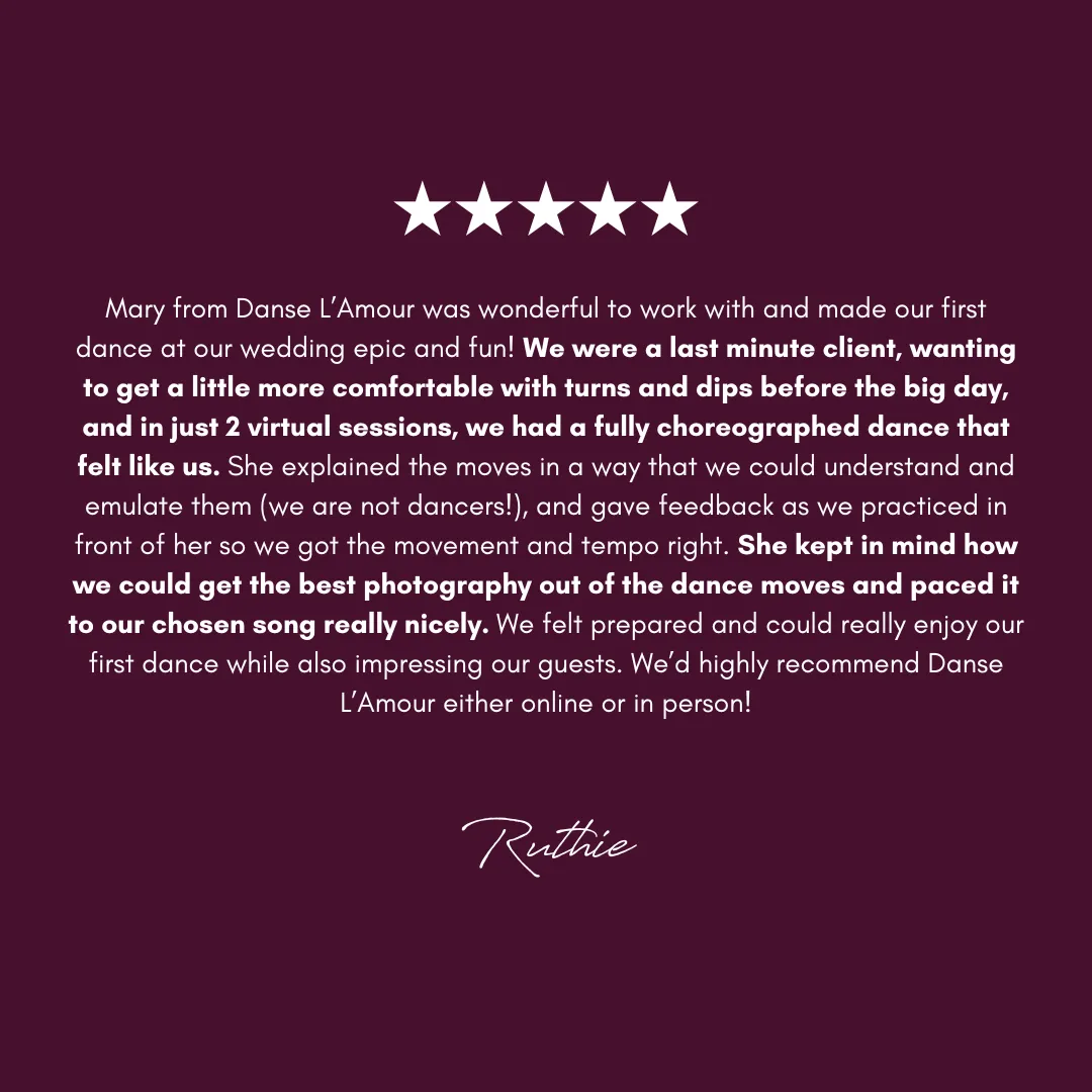 "Our instructor took our non-traditional song choice and crafted a routine WITH us & was a joy to see at each lesson. Mary made the process fun. It’s also a great way to bond with your partner and get a few date days/nights in before your wedding. We would 100% do it again!!
